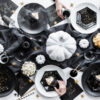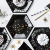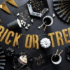 Talerzyki papierowe Trick or Treat w kolorze czarnym ze złotym wzorem, średnica ok. 20 cm. (1 op. / 6 szt.)