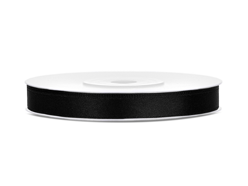 Tasiemka satynowa w kolorze czarnym, szerokość 6 milimetrów, długość 25 metrów.