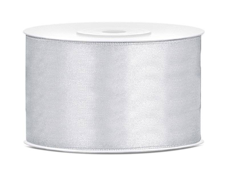 Tasiemka satynowa w kolorze srebrnym, szerokość 38 milimetrów, długość 25 metrów.