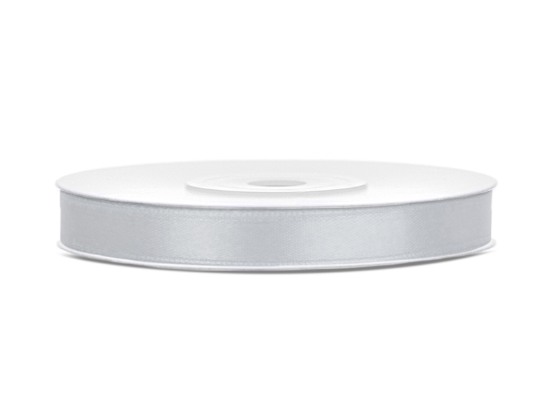 Tasiemka satynowa w kolorze srebrnym, szerokość 6 milimetrów, długość 25 metrów.