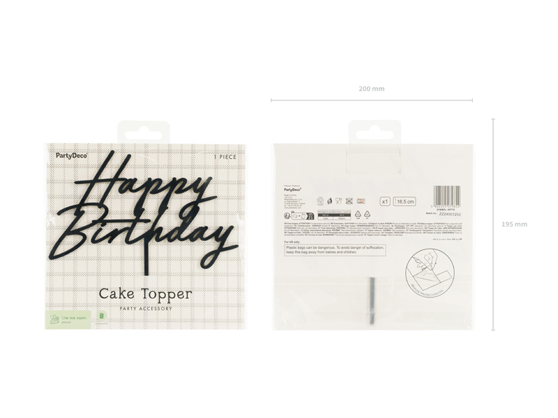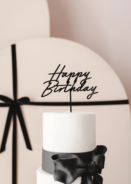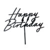 Topper akrylowy na tort Happy Birthday w kolorze czarnym, wysokość ok. 16.5 cm, szerokość około 18 cm.