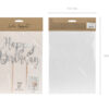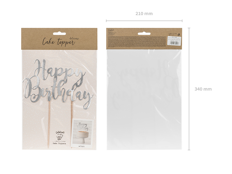 Topper na tort Happy Birthday, wykonany z papieru lustrzanego w kolorze srebrnym, wysokość ok. 22,5 cm.