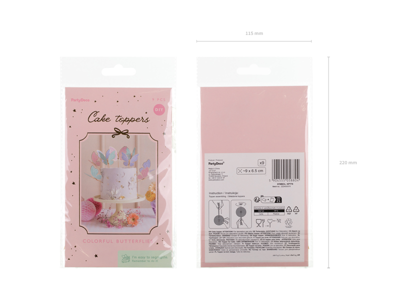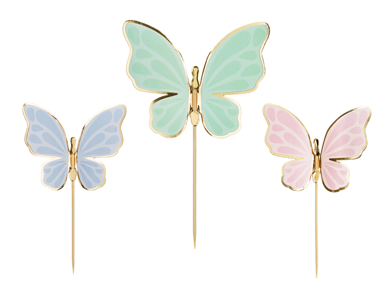 Toppery papierowe na tort Motylki, w kolorach niebieskim, zielonym i różowym. Wymiary pojedynczych elementów 9×6,5 cm. Zestaw zawiera 9 szt. motylków i 9 szt. patyczków. Produkt do samodzielnego złożenia. (1 op. / 9 szt.)