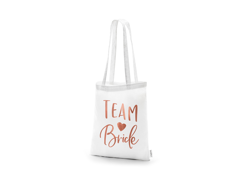 Torba wykonana z bawełny w kolorze białym z napisem Team bride w kolorze różowego złota, rozmiar ok. 39 x 42 cm.