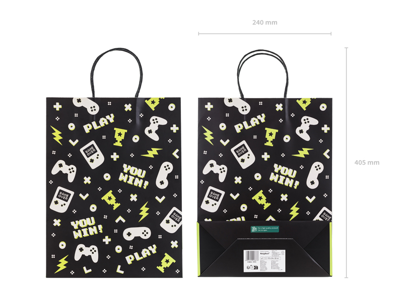 Torebka na prezenty Gamepady w kolorze czarnym z kolorowym nadrukiem, wymiary bez uchwytów ok. 10 x 24 x 32 cm.