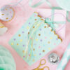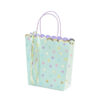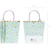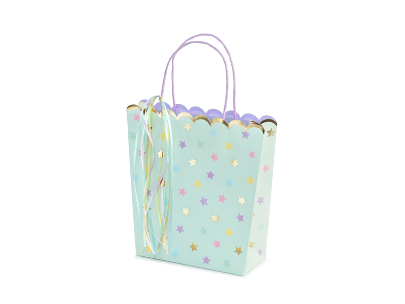 Torebki na prezenty w kolorze miętowym z kolorowym i złotym metalizowanym nadrukiem, kolorowymi tasiemkami i nadrukiem w kolorze fioletowym w środku torebek, wymiary bez uchwytów ok. 22 x 23 x 8 cm.