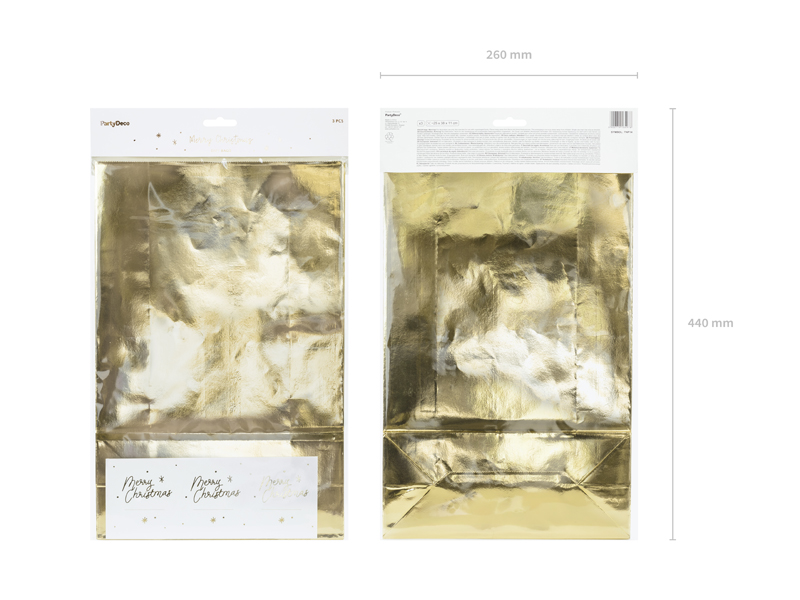Torebki na prezenty w kolorze złotym metalizowanym, zestaw zawiera 3 torebki i 3 naklejki, wymiary po złożeniu ok. 25 x 38 x 11 cm. (1 op. / 3 szt.)