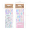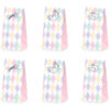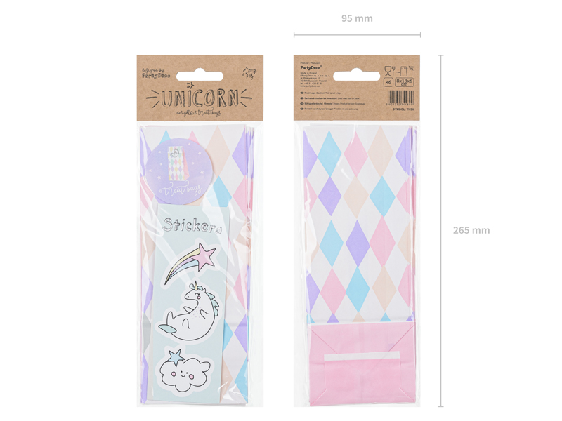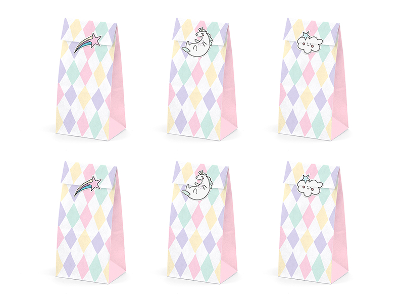 Torebki na słodycze Jednorożec, zestaw zawiera 6 torebek z nadrukiem i 6 naklejek, wymiary po złożeniu ok. 8 x 18 x 6 cm. (1 op. / 6 szt.)