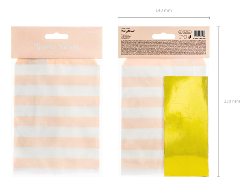 Torebki na słodycze Yummy, w kolorze jasnoróżowym, zestaw zawiera 6 torebek z nadrukiem i 6 naklejek, wymiary po złożeniu ok. 13 x 14 cm. (1 op. / 6 szt.)