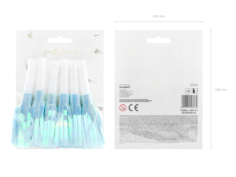 Trąbki Party w kolorze błękitnym, długość ok. 12.5 cm. (1 op. / 6 szt.)
