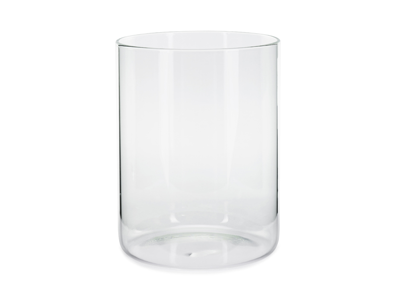 Szklana tuba na świece o średnicy ok. 13 cm i wysokości ok. 17cm.