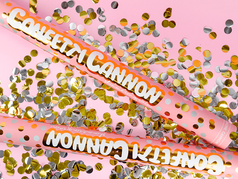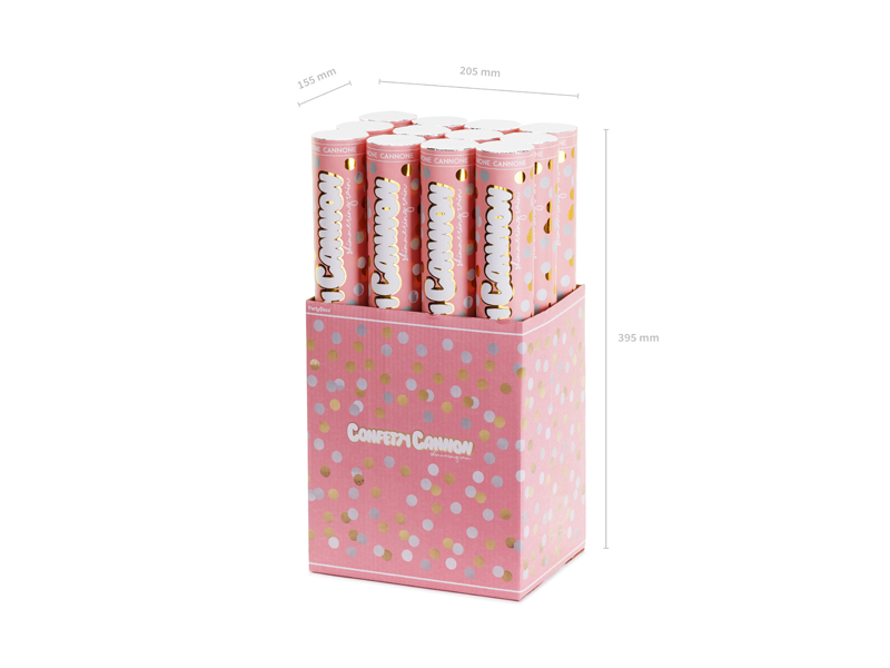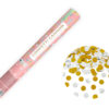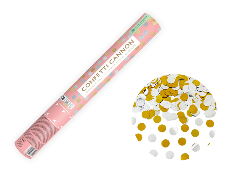 Tuba strzelająca metalicznymi dwustronnymi kółkami w kolorze srebrnym z jednej strony i złotym z drugiej strony, długość 40 centymetrów.