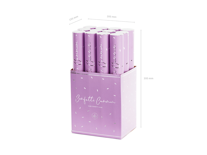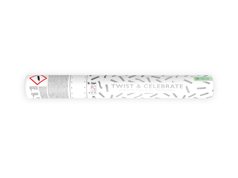 Tuba strzelająca bibułowym konfetti w kolorze srebrnym, długość ok. 40 cm.