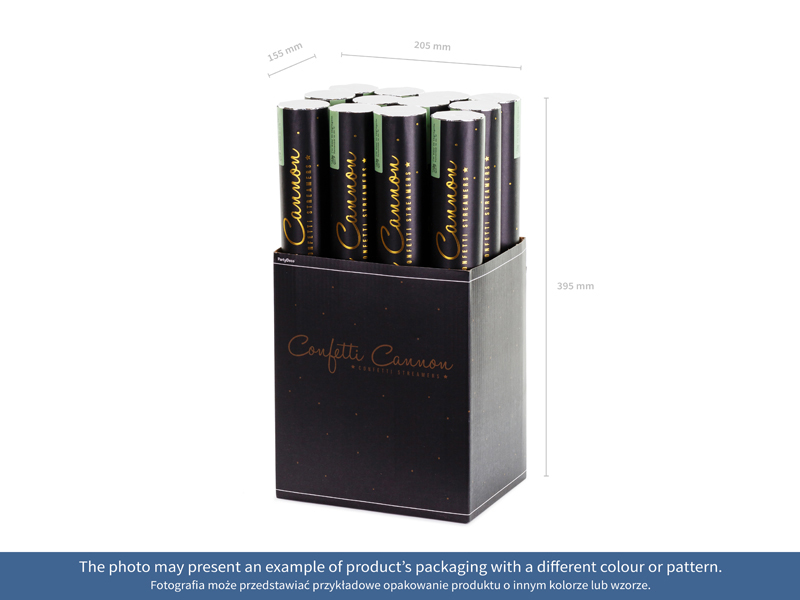 Tuba strzelająca długimi metalicznymi serpentynami w kolorze złotym, długość 40 cm.