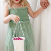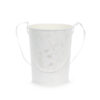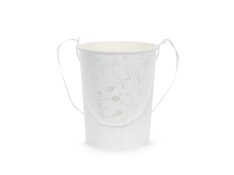 Papierowe wiaderko na płatki do sypania, wysokość około 13 cm, średnica 9-11 cm. Wiaderko w kolorze białym z perłowym, błyszczącym nadrukiem w kwiatki zawiera w zestawie białą, satynową wstążkę o długości 50 cm.