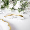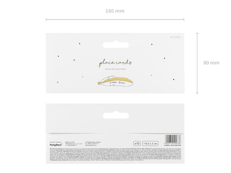 Wizytówki na stół w kształcie piórka, wykonane z papieru w kolorze białym ze złotym metalizowanym brzegiem, wymiary po złożeniu ok. 10,5 x 3 cm. (1 op. / 10 szt.)