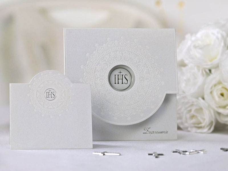Zaproszenia komunijne z ornamentem, biały (1 op. / 10 szt.)