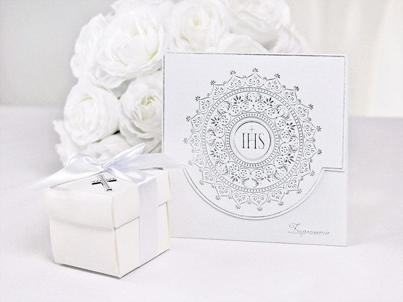 Zaproszenia komunijne w kolorze białym ze srebrnym ornamentem, w zestawie z kopertami. (1 op. / 10 szt.)