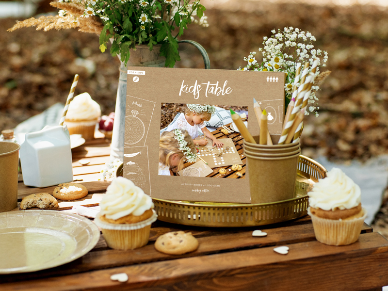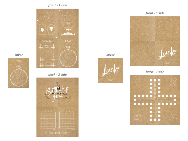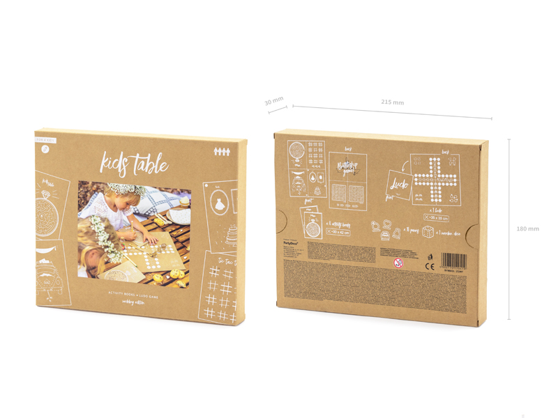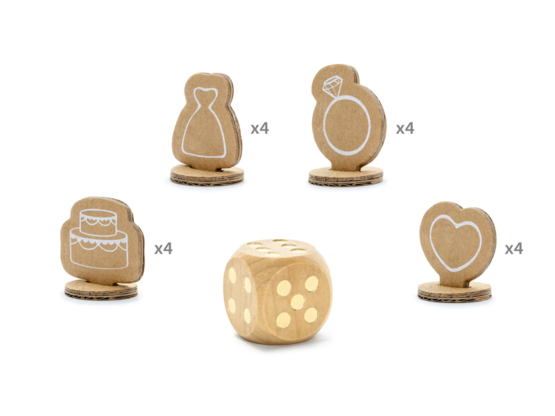 Zestaw gier dla dzieci na wesele, zawiera: 4 książeczki z grami (labirynt, wykreślanka, kolorowanka, kółko i krzyżyk, statki), 1 planszę do gry w chińczyka, 16 pionków, 1 drewnianą kostkę do gry.