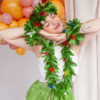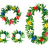 Zestaw hawajski, rozmiar uniwersalny dla osoby dorosłej. Zestaw zawiera naszyjnik, opaskę na głowę oraz 2 bransoletki. Akcesoria wykonane z zielonych materiałowych liści z dodatkiem kolorowych materiałowych kwiatów.